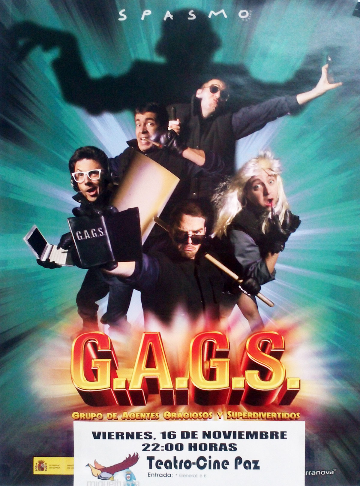El grupo salmantino Spasmo Teatro vuelve a Miguelturra con su última propuesta teatral denominada "G.A.G.S." (Grupo de Agentes Graciosos y Superdivertidos) el viernes día 16 de noviembre, a las 22:00 horas, en el Teatro-Cine Paz y el precio de la entrada es de 6 euros por persona.