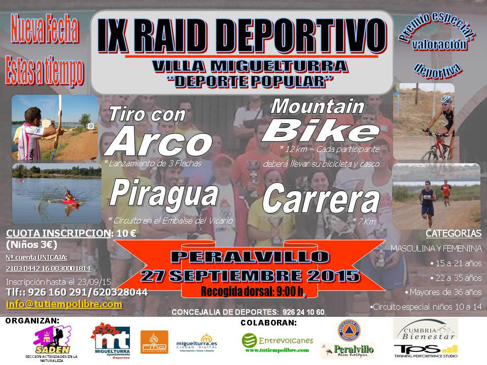 Este raid deportivo consistirá en pruebas de tiro con arco (lanzamiento de 3 flechas), mountain bike (12 kilómetros, cada participante deberá llevar su bicicleta y casco de protección), piragua (circuito en el Embalse del Vicario) y carrera (7 kilómetros), siendo la cuota de inscripción de 10 euros y 3 euros para niños-as, estando abiertas las inscripciones hasta el miércoles 23 de septiembre. Las categorías establecidas son masculina y femenina de 15 a 21 años, de 22 a 35 años, mayores de 36 años y, finalmente, un circuito especial para niños y niñas de 10 a 14 años.