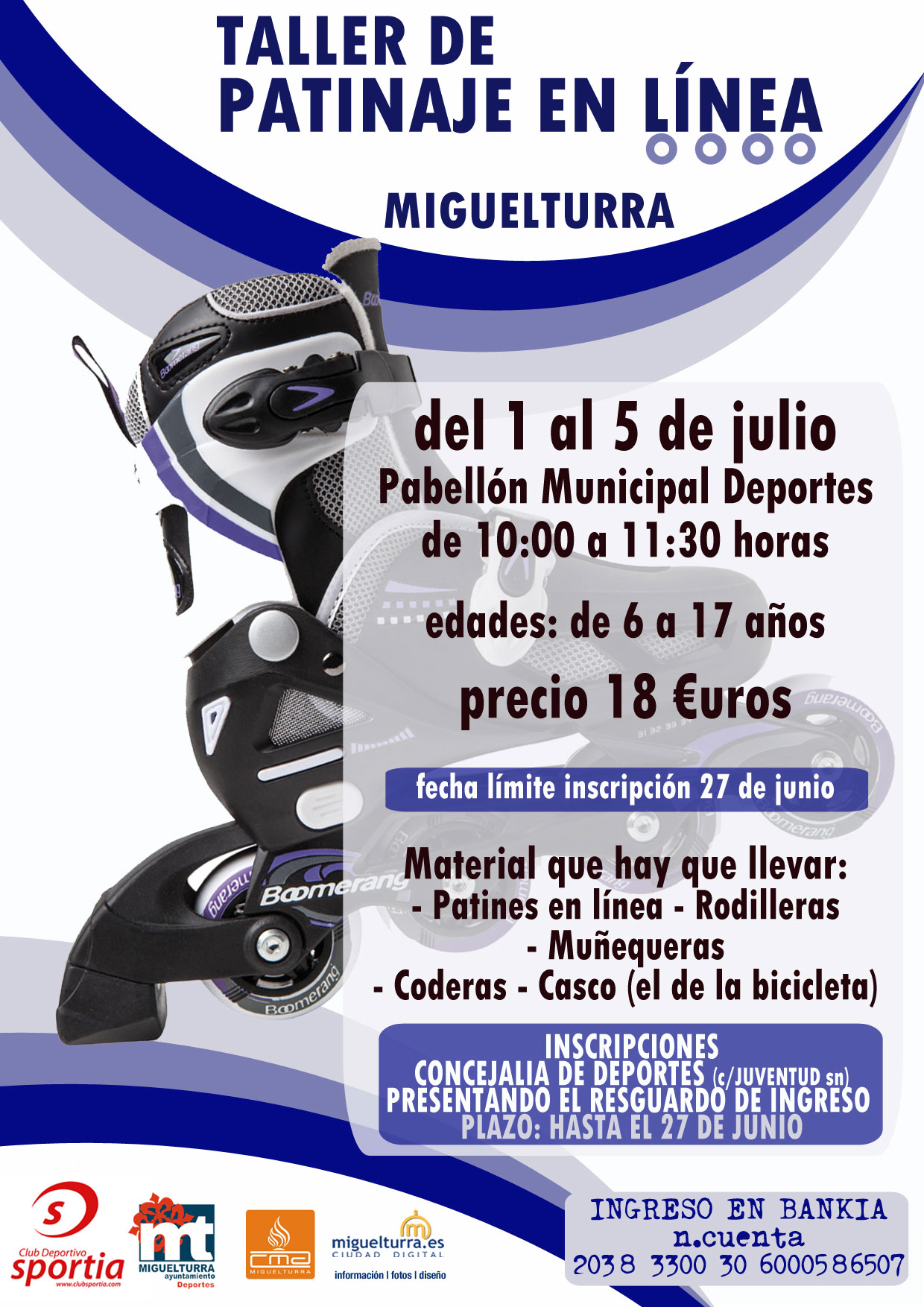 Del 1 al 5 de julio se desarrollará el primer taller de patinaje en línea de Miguelturra, organizado por Sportia Club Deportivo, en colaboración con la Concejalía de Deportes del Ayuntamiento de Miguelturra, Consejo Municipal de Deportes y el portal web municipal del consistorio www.miguelturra.es (diseño publicidad).