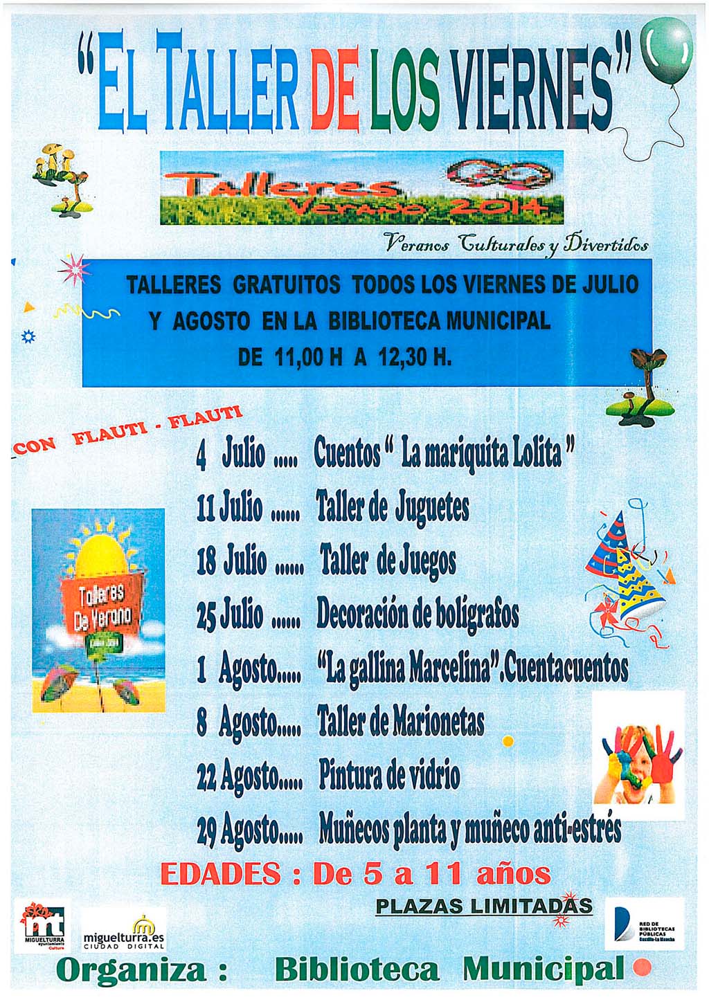 Dentro de las actividades organizadas por el Ayuntamiento de Miguelturra para este verano dentro del programa "Actívate 2014" la Biblioteca de Miguelturra pondrá en marcha a partir del viernes 4 de julio "El taller de los viernes" en colaboración con Flauti Flauti.