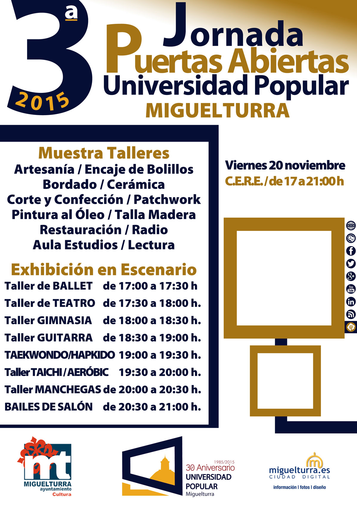 "En años anteriores, continua González, se ha contado con hasta 500 participantes, de los casi 25 talleres que se imparten en la Universidad Popular por eso, este año de nuevo, queremos invitar a los Miguelturreños a pasarse esa tarde por el CERE y de esa manera conocer el trabajo diario que se realiza en los diferentes talleres".