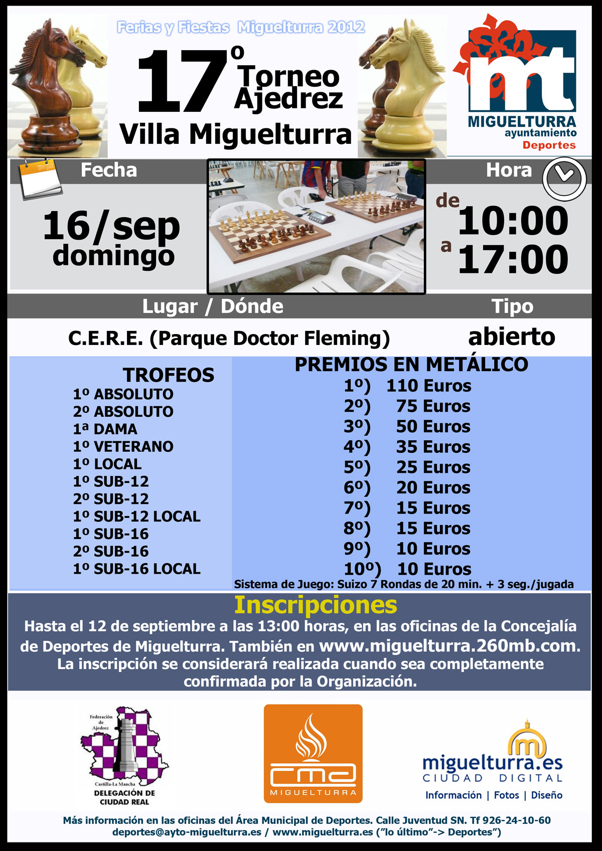 La Delegación de Ciudad Real de la Federación de Ajedrez de Castilla La Mancha, en colaboración con el Consejo Municipal de Deportes y este portal web www.miguelturra.es, que les dará a conocer gráficamente las imágenes de este torneo y clasificaciones una vez se dispute, realiza el Torneo de Ajedrez con motivo de las Ferias y Fiestas Patronales de Miguelturra de septiembre, torneo que se jugará el domingo 16 de septiembre a partir de las 10 de la mañana y finalizando aproximadamente a las 5 de la tarde, en el CERE, ubicado en la Plaza Doctor Fleming.
