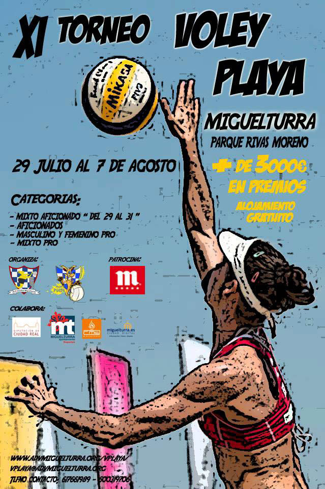 Un año más se acerca el Torneo de Vóley Playa Miguelturra, uno de los torneos de interior de mayor envergadura y con mayor número de participantes. En pocos días se abrirá el plazo de inscripción en las categorías Masculino Pro, Femenino Pro, Mixto Pro, Aficionado y Mixto Aficionado (esta última del 29 al 31 de julio) en colaboración con la Concejalía de Deportes del Ayuntamiento de Miguelturra y Diputación Provincial de Ciudad Real.