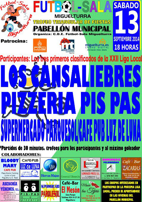Dentro de las actividades de las Ferias y Fiestas de Miguelturra 2014 el sábado 13 de septiembre se desarrollará entre las 6 de la tarde y las 9 de la noche un Triangular de Fútbol Sala Especial Ferias en el que participarán los equipos locales "Los Cansaliebres", "Pizzería Pis Pas" y "Supermercado Parquesol / Café Pub Luz de Luna", partidos que se jugarán en el Pabellón Municipal de Deportes, y al que pueden asistir hasta completar aforo.