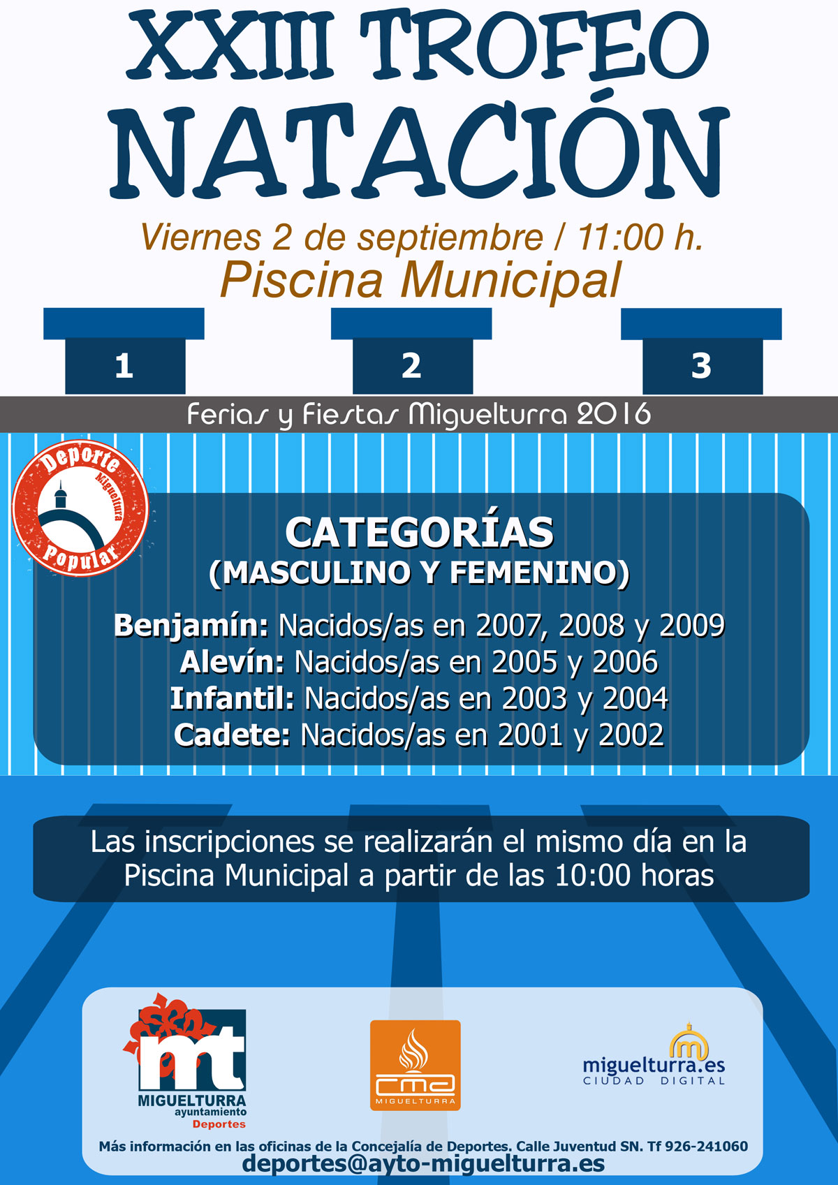 Las inscripciones se podrán realizar el mismo día del Trofeo de Natación en las instalaciones de la Piscina Municipal a partir de las 10:00 horas. Las personas interesadas en esta actividad podrán encontrar más información en deportes@ayto-miguelturra.es, en las oficinas de la Concejalía de Deportes del Ayuntamiento o en el teléfono 926-24-10-60.