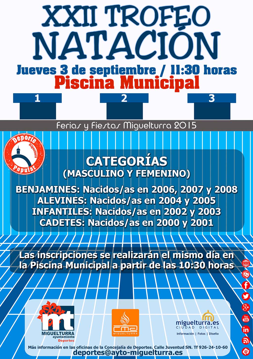 Dentro de la programación que la Concejalía de Deportes del Ayuntamiento de Miguelturra para las Ferias y Fiestas de Miguelturra 2015, se da a conocer el Trofeo de Natación, que hace la edición número veintitrés, que se desarrollará el jueves 3 de septiembre en la Piscina Municipal, en el que colabora el portal web www.miguelturra.es, y que tiene categoría de "Deporte Popular".