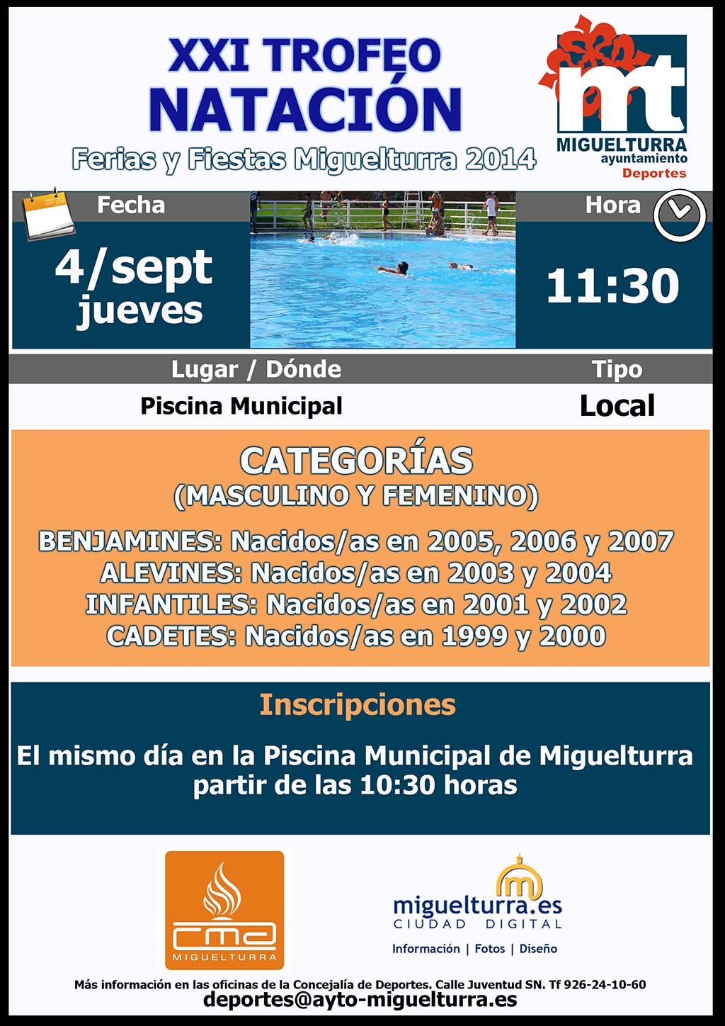El Área de Deportes, dentro de la programación de actividades programadas para las Ferias y Fiestas de Miguelturra, y en colaboración con el portal web www.miguelturra.es, desarrollará el jueves 4 de septiembre a partir de las 11:30 horas el Trofeo Local de Natación de Ferias que en este año ya cumple su vigesimoprimera edición.