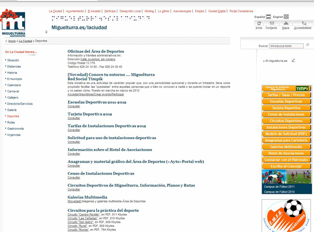 Para ello, se ha incluido un nuevo acceso destacado en la parte derecha de la página de inicio de www.miguelturra.es para tener un acceso más directo y rápido a toda la información deportiva. Por otra parte, una vez que estamos en el área web de deportes también se han ubicado botones en la parte derecha de la misma que nos dirigen directamente a la información reseñada.